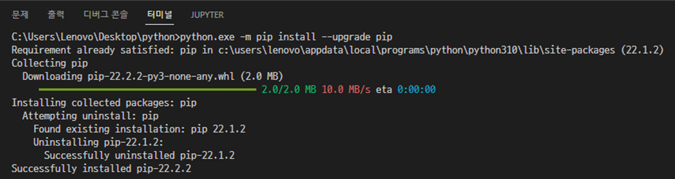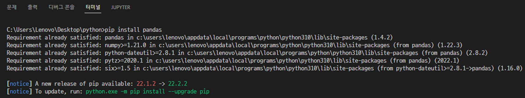 저의 경우, 이미 pandas가 설치되어 있기 때문에 Requirement already satisfied 라는 문구가 뜨네요.